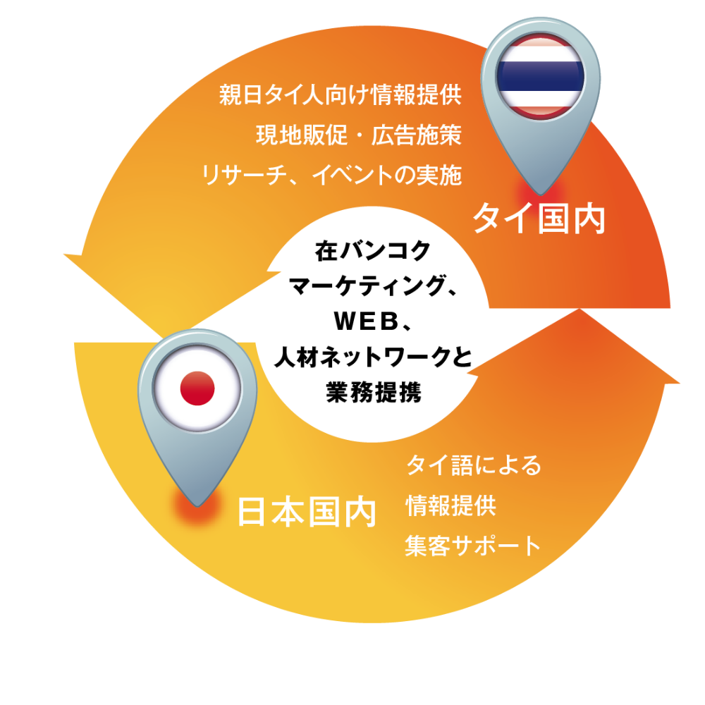 日本国内企業、タイ国内企業のマーケティング活動をそれぞれの企業の課題に合わせ、効果的なマーケティングサイクルを創出し、サポートいたします。